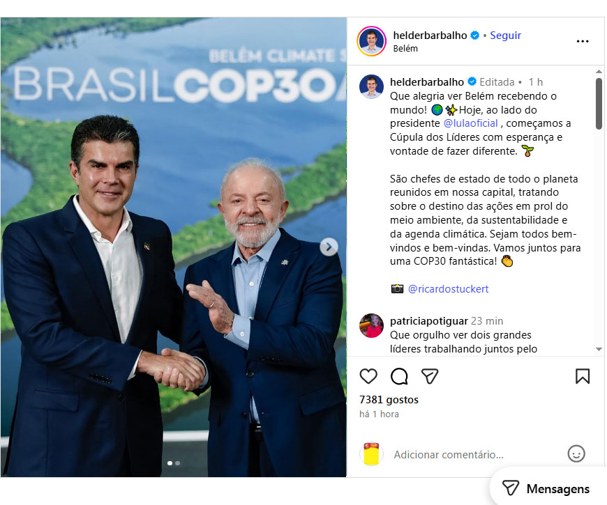Na publicação em seu perfil oficial no Instagram, Helder também ressaltou o caráter histórico da reunião internacional, que conta com chefes de Estado e representantes de organismos multilaterais. “São chefes de estado de todo o planeta reunidos em nossa capital, tratando sobre o destino das ações em prol do meio ambiente, da sustentabilidade e da agenda climática. Sejam todos bem-vindos e bem-vindas. Vamos juntos para uma COP30 fantástica!”, completou.