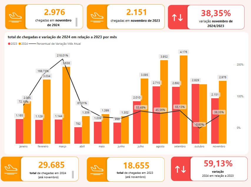 Dados da Agência Brasileira de Promoção Internacional do Turismo (Embratur) já dão conta da escalada da procura de Belém como destino internacional. Uma comparação entre janeiro a novembro de 2023 (antes do anúncio da cidade como sede da COP) e janeiro a novembro de 2024 indica crescimento superior a 59% nas chegadas por via aérea na capital paraense. No período desses 11 meses em 2023 houve 18.655 chegadas, contra 29.685 em 2024, ano de movimentação recorde no Aeroporto Internacional Júlio Cezar Ribeiro. Nacionais do Suriname, França, Estados Unidos, Portugal e Holanda formam os principais grupos a desembarcar em Belém no último ano.