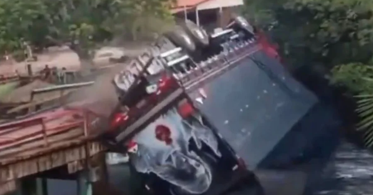 Imagens divulgadas nas redes sociais mostram o momento em que o veículo tenta atravessar a ponte lentamente. Ao se aproximar do final da estrutura, parte da madeira rompe e o caminhão cai de cabeça para baixo na água.