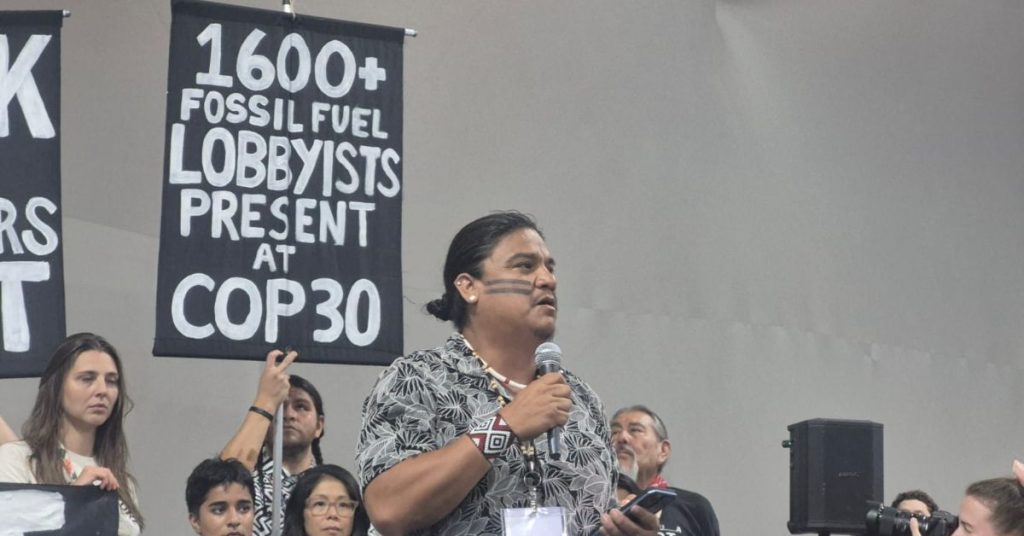 “De quantos executivos e lobistas do setor de petróleo estão aqui dentro da COP 30? Gostaríamos de reconhecer a terra em que estamos e condenar o que ocorreu há poucos dias, quando nossos irmãos e irmãs foram impedidos de participar dessa conversa. Estamos nas terras deles, dentro de suas comunidades. As vozes indígenas precisam ser ouvidas e não somente as da indústria de combustíveis fósseis”, afirmou.