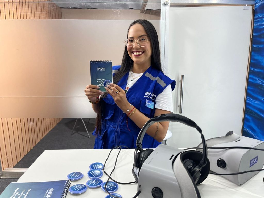 “Nos nossos óculos aparecem depoimentos de pessoas que vivem em regiões afetadas pela crise climática. Elas falam por meio da OIM, buscando ser ouvidas e contribuir com o debate global sobre o tema. É uma experiência em 360 graus que mostra realidades de quem está na linha de frente dessas transformações”, explicou.