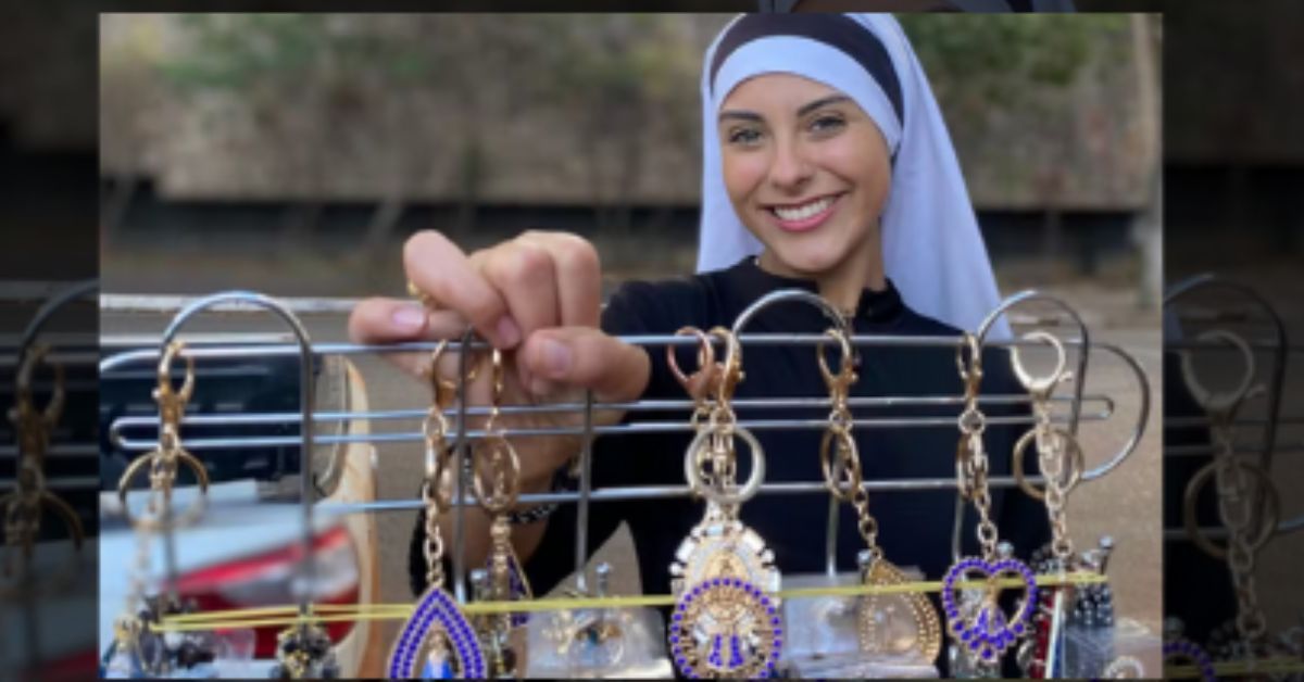A freira Kamila Cardoso, conhecida nas redes sociais como irmã Eva, se tornou um fenômeno viral após ser filmada vendendo artigos religiosos em um bar