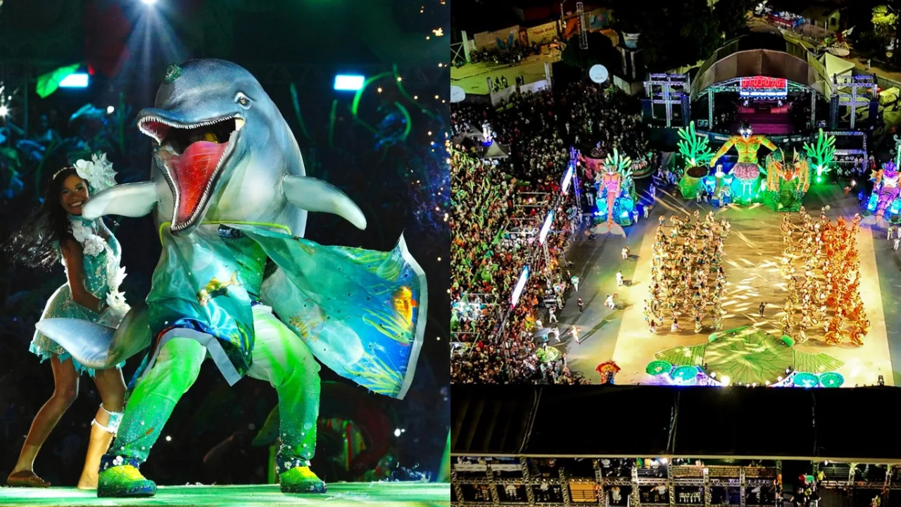 O tema “Morada Pirajaguara”, defendido pela agremiação, foi um dos pontos altos da performance, destacando a relação ancestral do boto com as comunidades ribeirinhas e a preservação ambiental.
