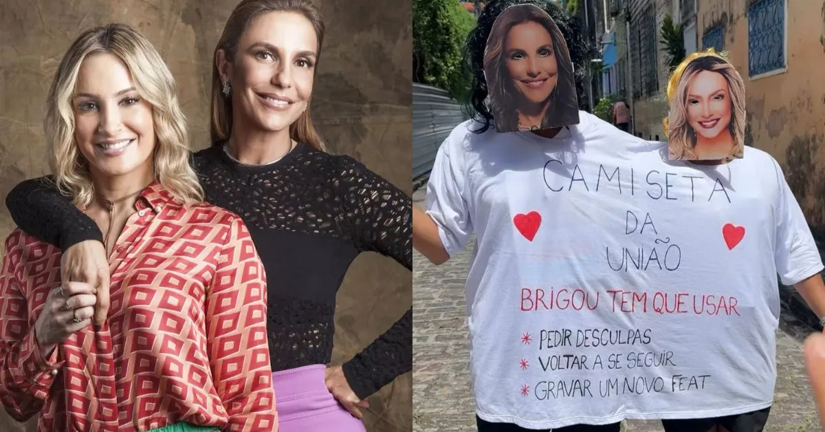 Foi então que Alex Matos e Michel Barretto, foliões que não perdem a chance de brincar com os acontecimentos do momento, decidiram levar a treta para outro nível: transformaram Ivete e Claudia na famosa “camisa da união”. O meme, que viralizou na internet após uma mãe vestir os filhos brigões em uma única camiseta para forçá-los a se entenderem, agora serviu de inspiração para um dos trajes mais comentados do pré-Carnaval baiano.