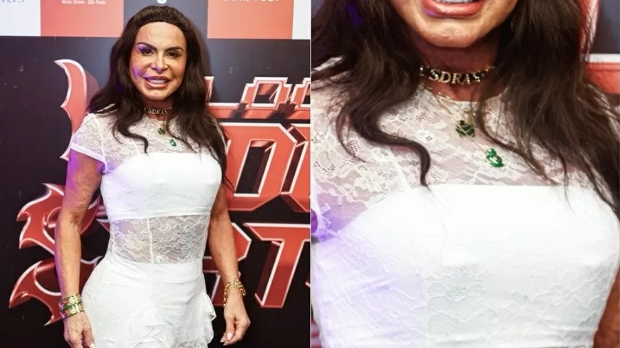 Conhecida como a “rainha do rebolado”, Gretchen escolheu uma gargantilha preta estilo coleira, adornada com pingentes de strass que soletram “Esdras”, nome de seu marido, o saxofonista Esdras de Souza. A peça chamou atenção tanto pela ousadia quanto pela homenagem romântica.