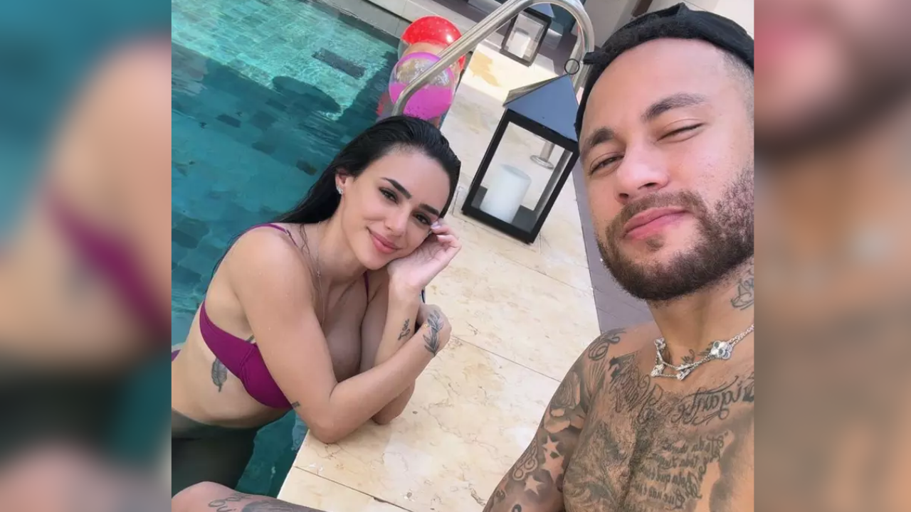 O jogador de futebol brasileiro, de 32 anos, publicou uma foto ao lado de sua namorada, Bruna Biancardi, enquanto aproveitavam a piscina de sua mansão em Dubai.