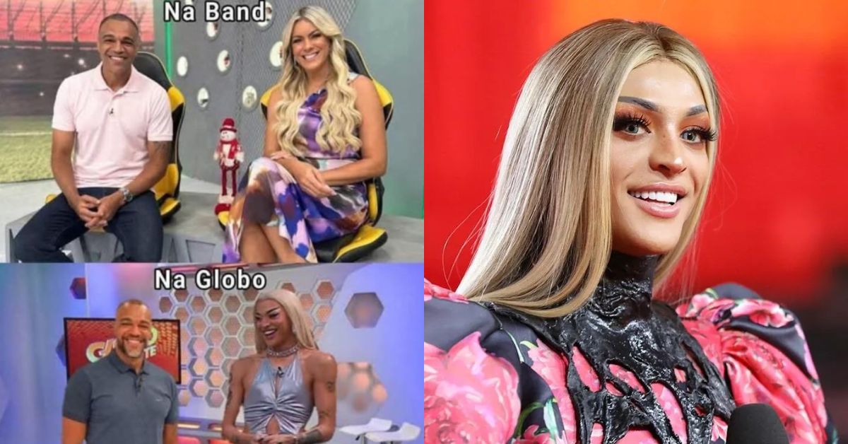 No primeiro quadro, intitulado “Na Band”, Renata aparece ao lado de Denilson, ex-colega no programa “Jogo Aberto”. No segundo, com a legenda “Na Globo”, a imagem foi editada para incluir Pabllo Vittar ao lado de Denilson no estúdio do “Globo Esporte”.