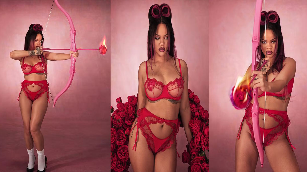 Além disso, a cantora também apareceu com um arco de rosas, enquanto exibia o corpo em uma lingerie vermelha, com transparência nos seios e corações para cobrir os mamilos. Repleta de rendas, a parte de baixo da vestimenta é fio dental, tabém da sua marca SAVAGE X FENTY.