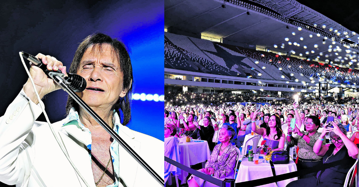 sOcorreu na noite da última segunda-feira (30), o show do cantor Roberto Carlos, no Estádio do Mangueirão, em Benguí, Belém. As mesas dispostas no gramado, assim como as cadeiras do anel inferior, ficaram lotadas de fãs do rei, que subiu ao palco às 20h30, cantando o clássico “Emoções”, o que levou o público à euforia.