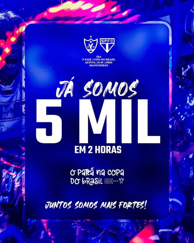 O Águia vendeu em apenas duas horas 5 mil ingressos para a partida do dia 2 de maio, às 19h30, no Mangueirão, valendo pela Copa do Brasil 2024.
