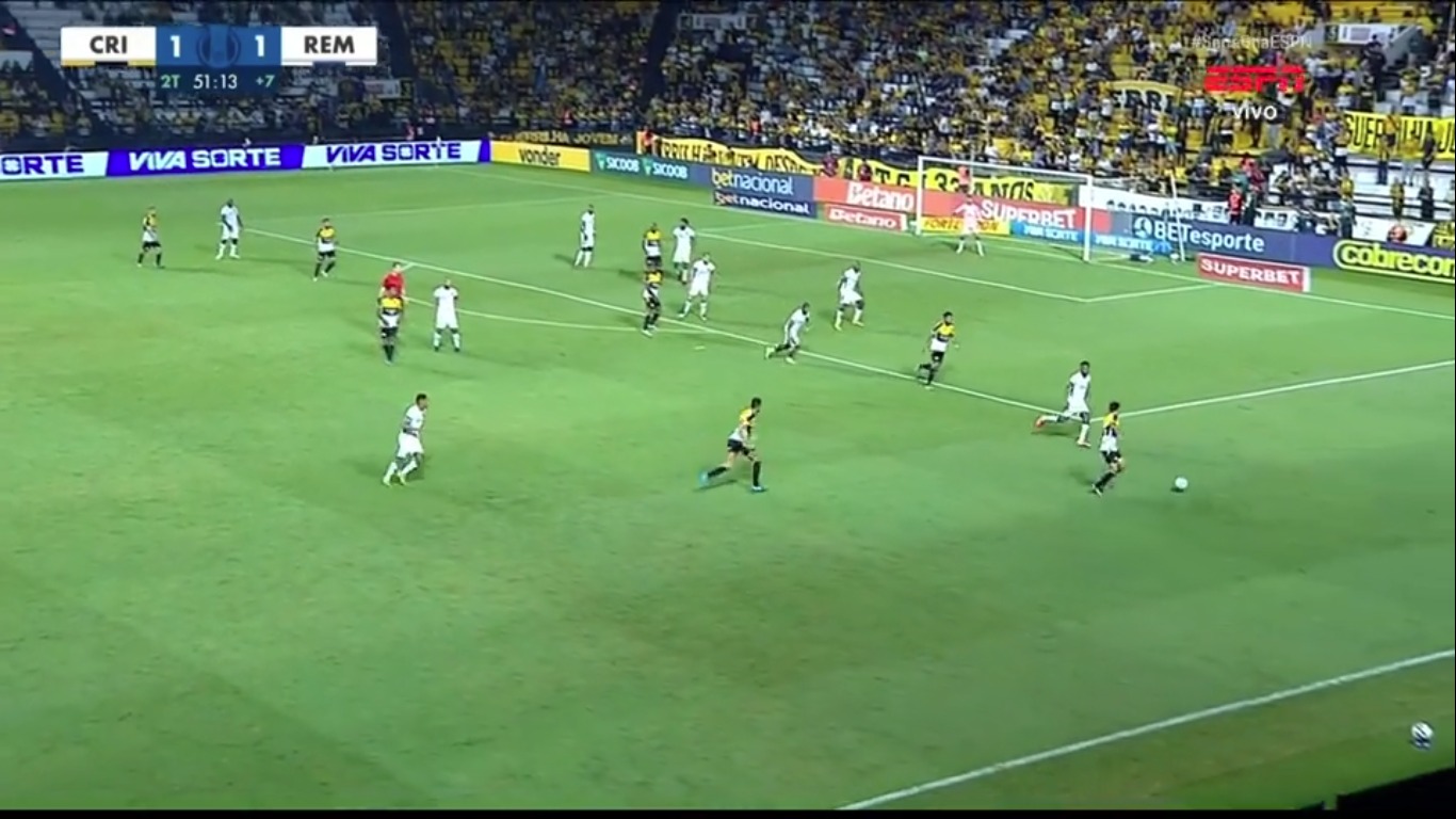 Na frente do placar e com outra postura, o Criciúma passou a controlar a partida, trocando passes com tranquilidade e dificultando a saída de bola do Remo após adiantar as linhas de marcação.