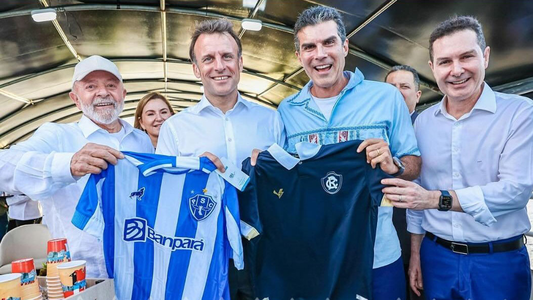 O governador do Pará, Helder Barbalho, compartilhou em seu perfil no Instagram um momento especial durante a visita do presidente francês, Emmanuel Macron, ao estado. Helder presenteou Macron com diversas representações dos símbolos da Amazônia, incluindo as icônicas camisas marajoaras de Clube do Remo e Paysandu.Em sua publicação, o governador destacou a importância da parceria entre Pará e França na busca pela promoção da bioeconomia e pela preservação da Amazônia. Além disso, ressaltou o apoio do ex-presidente Luiz Inácio Lula da Silva nesse esforço conjunto.CONTEÚDO RELACIONADOSustentabilidade e bioeconomia são pautas de Lula e MacronLula e Macron desembarcam em Belém e vão à Ilha do CombuMacron condecora Raoni com mais alta honraria da FrançaA troca de presentes simboliza não apenas a valorização da cultura e tradição paraenses, representadas pelas camisas marajoaras dos clubes de futebol donos das maiores torcidas do Norte do país, mas também a união de esforços em prol da sustentabilidade e do desenvolvimento da região amazônica. Quer saber mais notícias do futebol paraense? Acesse nosso canal no WhatsApp.O gesto de Helder Barbalho evidencia o compromisso do governo estadual em fortalecer parcerias internacionais para enfrentar os desafios ambientais e socioeconômicos da Amazônia.Diante do cenário global de preocupações com o desmatamento e as mudanças climáticas, a iniciativa demonstra um esforço conjunto para encontrar soluções sustentáveis que conciliem o progresso econômico com a conservação ambiental, visando garantir um futuro próspero para as gerações presentes e futuras na Amazônia. Ver esta publicação no Instagram Uma publicação partilhada por Helder Barbalho (@helderbarbalho)VEJA MAIS: