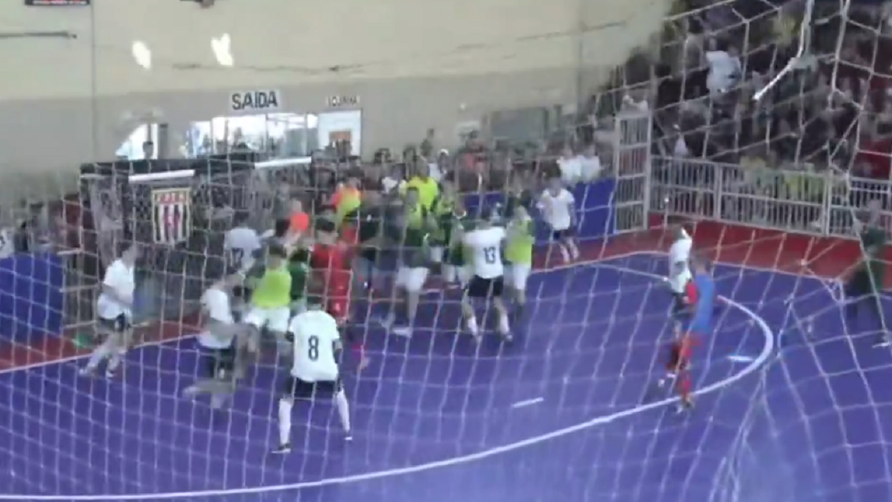 A final do Campeonato Metropolitano Sub-18 de futsal neste sábado (27), entre Palmeiras e Corinthians, terminou antes do apito final com uma pancadaria generalizada.O Palmeiras estava vencendo por 5 a 2 quando uma discussão entre os jogadores resultou em uma briga com invasão de torcedores na quadra do ginásio Presidente Ciro II, na Penha, zona leste de São Paulo.A menos de dois minutos para o fim do jogo, o Corinthians perdeu a bola no campo de ataque até que os jogadores começaram a se empurrar.Com isso, uma grande briga começou na quadra. Os torcedores que acompanhavam na arquibancada entraram na quadra e começaram a agredir os jogadores menores de idade. A partida terminou com uma pancadaria generalizada.Na súmula da partida, o árbitro Felipe de Fabio Ventura destaca a falta de policiamento preventivo. A partida é considerada suspensa temporária ou definitivamente.O Palmeiras publicou uma nota oficial com duras críticas à Federação Paulista de Futebol de Salão.O clube afirmou que alguns jogadores do time — menores de idade — ficaram feridos com as agressões de torcedores e exigiu o adiamento das partidas da categoria sub-16 e sub-14 do mesmo torneio. O Palmeiras informou ainda que vai registrar boletim de ocorrência e pediu punição à Federação e aos agressores.O UOL entrou em contato com a Federação Paulista de Futebol de Salão, que organiza o torneio, e aguarda o retorno.