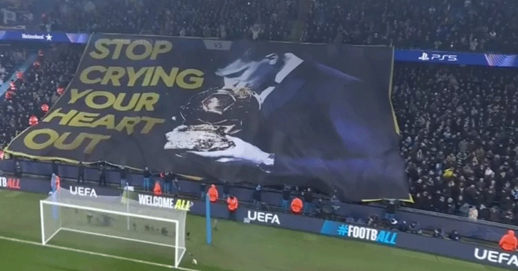 A organizada 1894 Manchester já havia anunciado que usaria um bandeirão provocativo, trazendo a imagem de Rodri beijando a Bola de Ouro e a frase “Stop crying your heart out” (“Pare de chorar com todo o seu coração”) – título de uma das canções de maior sucesso da banda Oasis. A direção do City entrou na onda e, antes mesmo do jogo, publicou uma foto de Vini Jr. passando pelo estádio ao lado de uma imagem semelhante. A postagem, porém, foi apagada minutos depois.