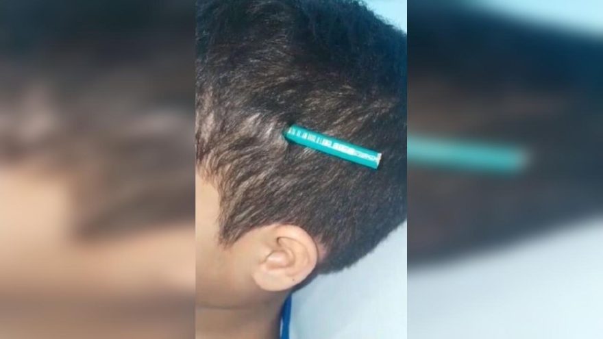 Kaue foi levado ao hospital e ficará em observação por 10 dias. Os médicos ainda não localizaram a ponta do lápis, levantando a suspeita de que o objeto possa ter ficado alojado. Caso isso se confirme, uma cirurgia poderá ser necessária.