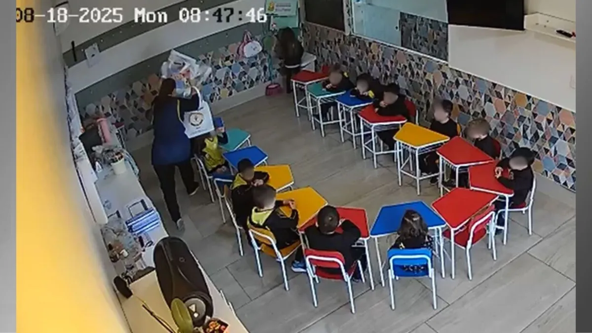 A imagem mostra uma sala de aula infantil com mesas e cadeiras coloridas. De acordo com a delegada Thalita Giacomiti Andriche, responsável pelo inquérito, o caso é investigado como maus-tratos qualificado pela lesão grave, mas também pode ser enquadrado como tortura.