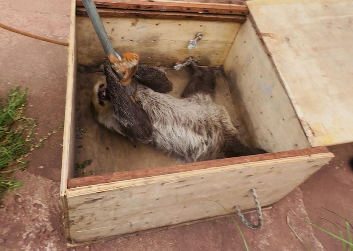 Bicho-preguiça preso em fios telefônicos é resgatado