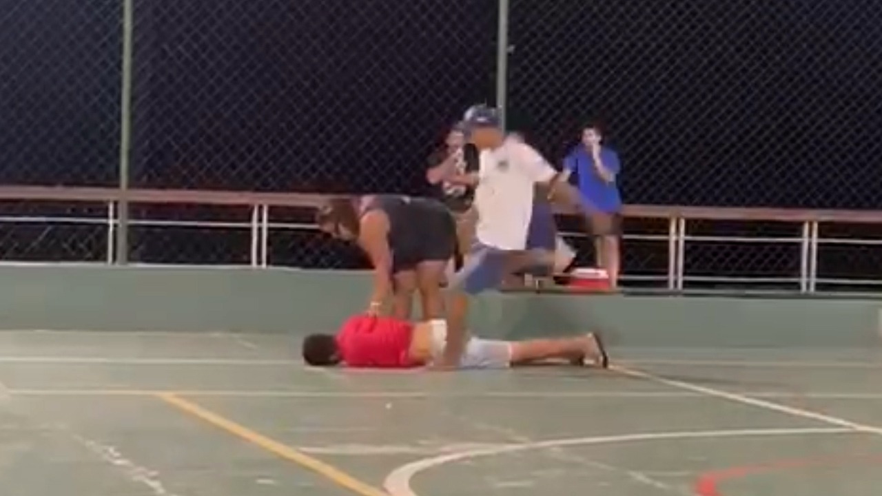 Em um vídeo que circula nas redes sociais, é possível observar um grupo de pessoas envolvido em uma briga generalizada. Durante a confusão, um homem que aparece de camisa vermelha cai desacordado no chão, após ser atingido por vários golpes, enquanto uma mulher de vestido preto tenta socorrê-lo. Outro rapaz, de camisa branca, desfere um chute na cabeça do homem caído.