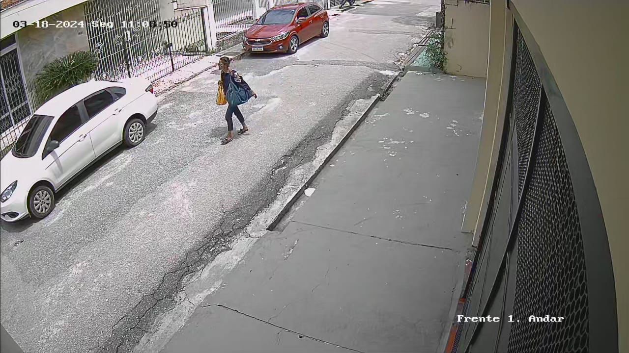 Imagens de câmeras de segurança de um prédio vizinho a residência da advogada Cecília Melca, tutora do cachorrinho, mostram uma mulher com várias sacolas e mochilas andando desconfiada pela rua, às 11h50 da manhã. Cecília conta que o animal se chama Tobby, é muito dócil e se dá facilmente com as pessoas.