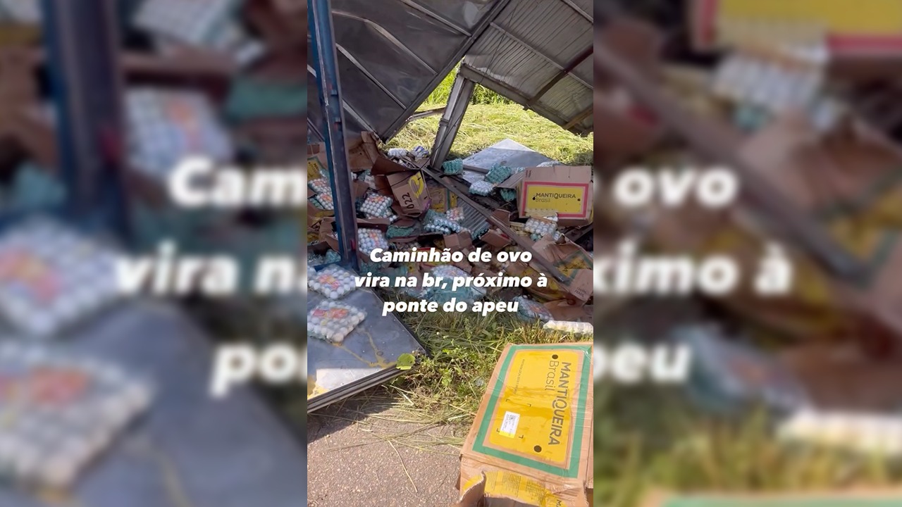[Um caminhão que transportava cubas de ovos se envolveu em um acidente na manhã desta sexta-feira (20), nas proximidades da ponte do Apeú, em Castanhal, no nordeste do Pará.