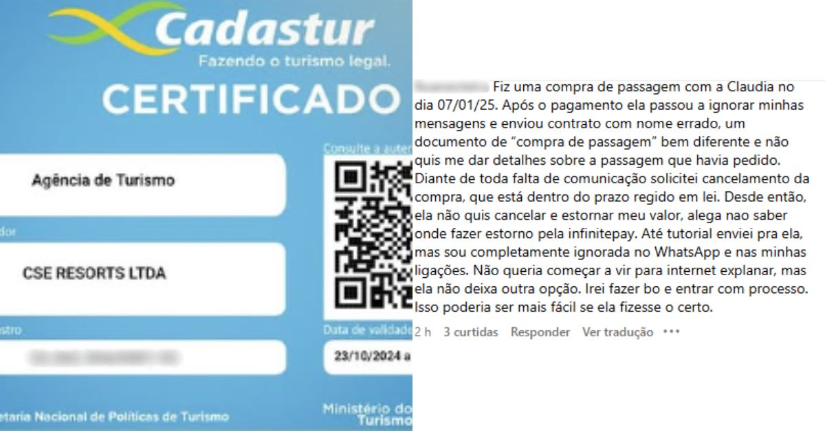 “Diante de toda falta de comunicação solicitei cancelamento da compra, que está dentro do prazo regido em lei. Desde então, ela não quis cancelar e estornar meu valor, alega nao saber onde fazer estorno pela infinitepay. Até tutorial enviei pra ela, mas sou completamente ignorada no WhatsApp e nas minhas ligações”, disse a denúncia, em comentário no próprio Instagram da agência.