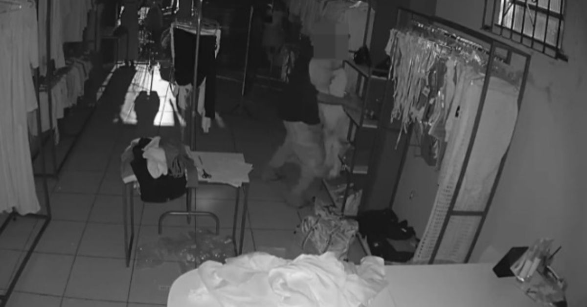 Em um dos trechos da gravação, um homem aparece entrando na loja e retirando diversas peças de roupa que estavam expostas em uma arara. Após reunir parte dos produtos, ele deixa o estabelecimento carregando os itens.