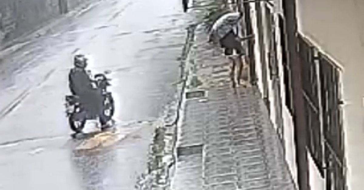 Ao perceber a situação, a mulher hesitou por alguns instantes, mas rapidamente buscou proteção ao entrar no portão de uma residência próxima, interrompendo o contato com o agressor. Após observar a entrada do imóvel por alguns segundos, o suspeito deixa o local na motocicleta.