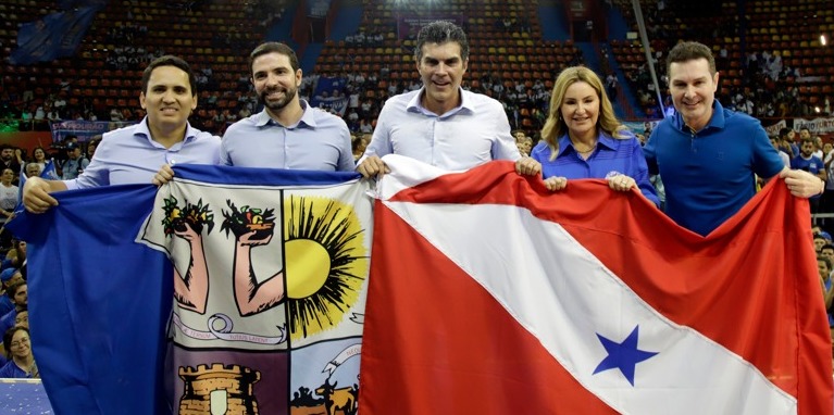 O evento ocorreu no Ginásio Mangueirinho, anexo ao Estádio Olímpico do Pará, o Mangueirão, e contou com a presença de líderes do MDB, incluindo o governador do Pará, Helder Barbalho, e o ministro das Cidades do governo Lula, Jader Filho.