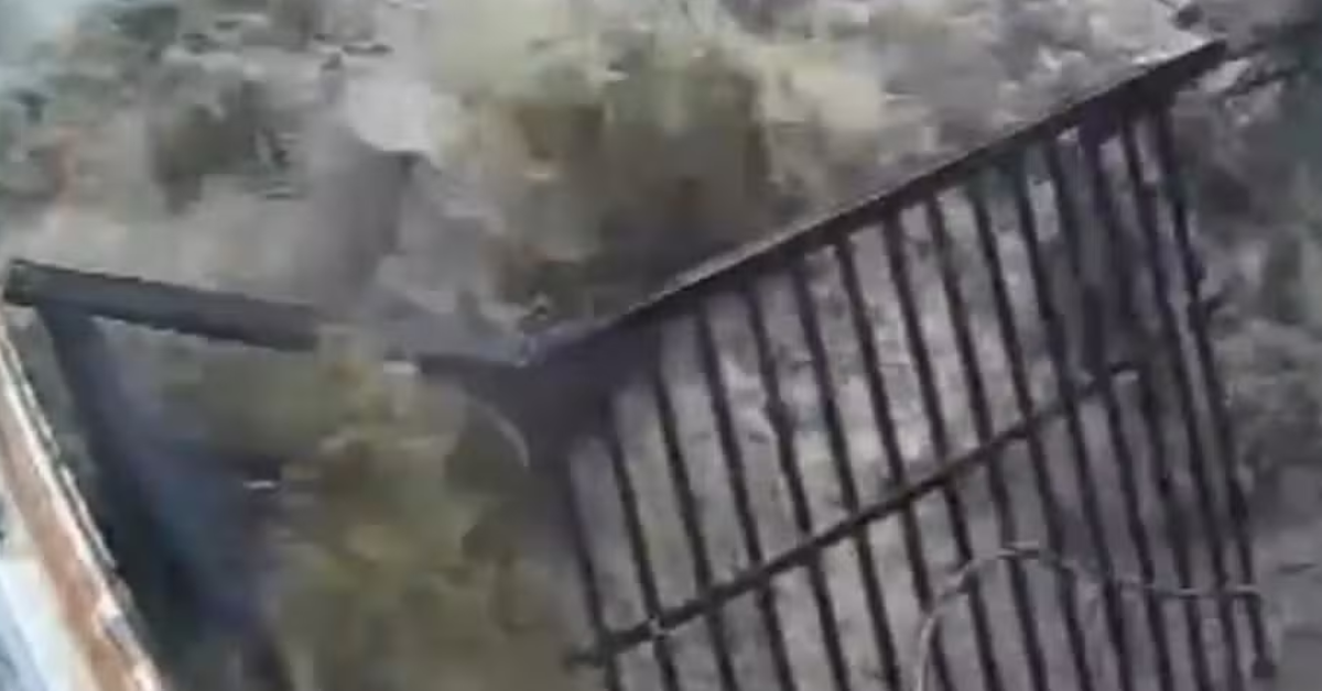 As imagens mostram o momento em que a estrutura se rompe e a água invade as ruas, destruindo imóveis, derrubando postes e arrastando veículos estacionados.
