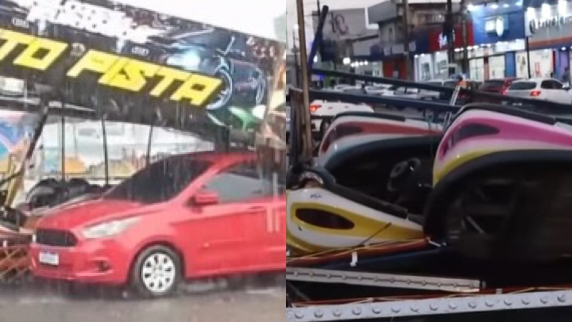 O caso aconteceu na tarde da última terça-feira (13), quando um caminhão baú atingiu a estrutura de uma atração conhecida como “auto pista”, instalada no local. De acordo com testemunhas, o veículo se aproximava da área ou realizava uma manobra nas imediações do parque no momento da colisão. O impacto foi suficiente para fazer ceder a cobertura e parte da estrutura metálica do brinquedo, que desabou parcialmente em questão de segundos.