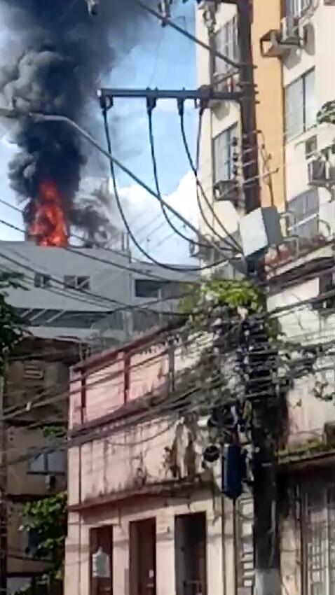 Nas imagens é possível ver grande quantidade de fumaça preta saindo do terraço do prédio.