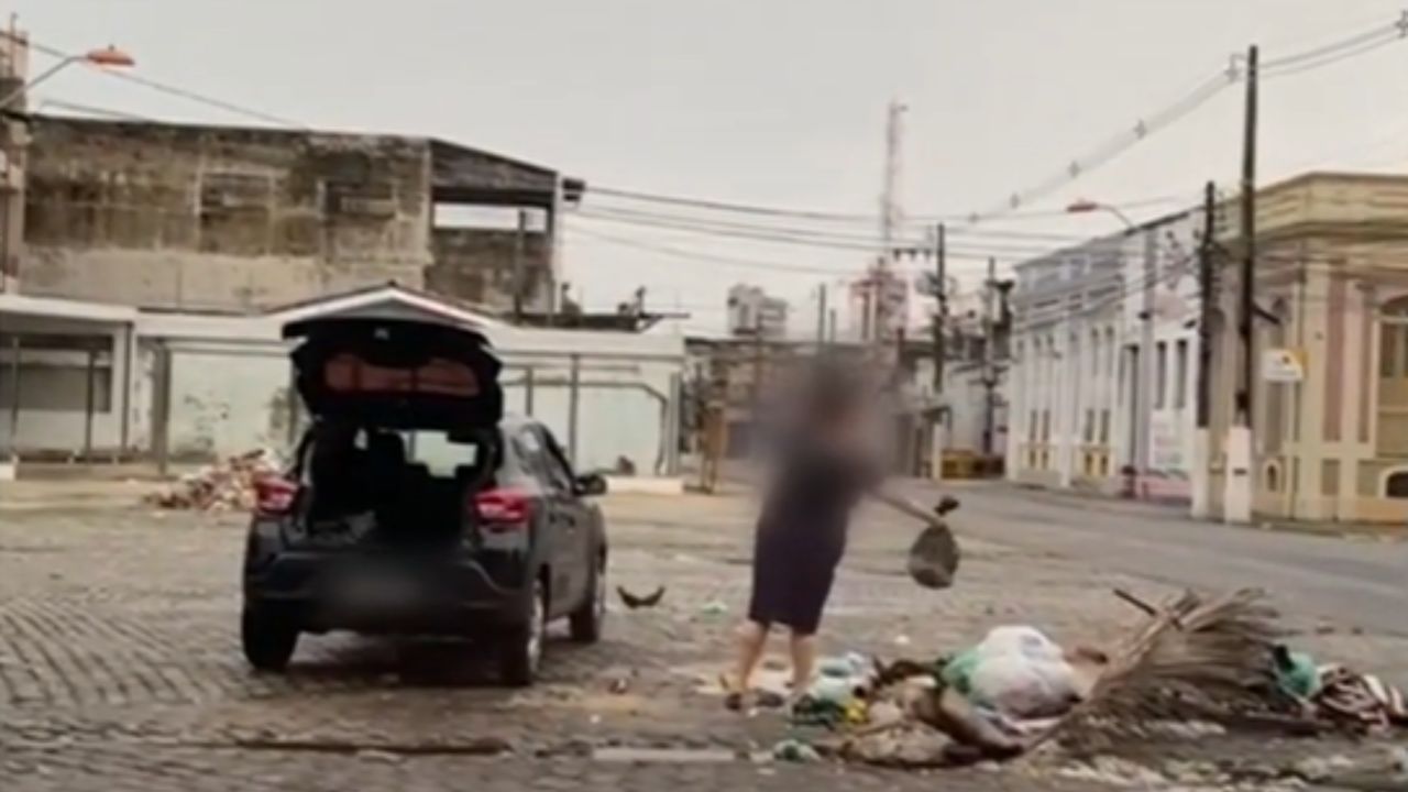 Uma cena chamou a atenção na avenida 16 de Novembro entre a rua Óbidos, no bairro da Cidade Velha, centro de Belém. No local, uma mulher abre o porta-malas de um carro preto e despeja cinco sacos de lixo na beira da avenida.