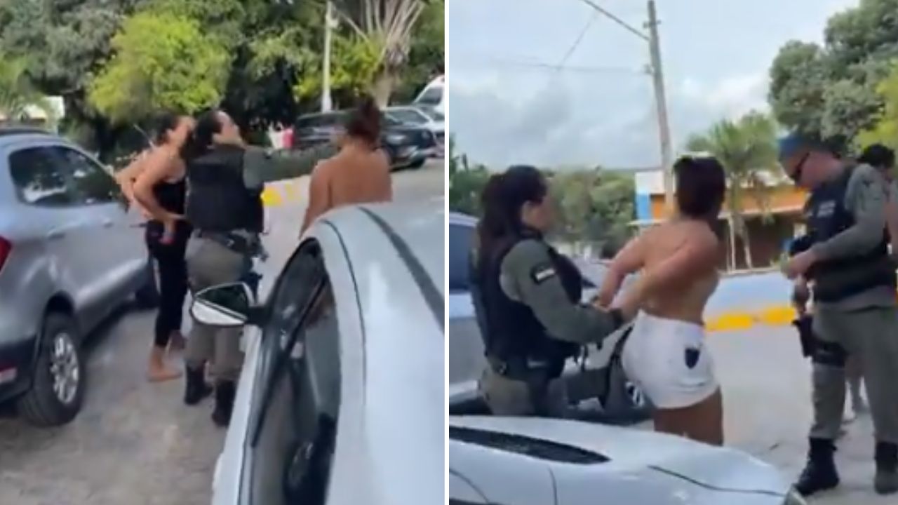 A policial continua: “Foi tu que fizeste isso? Foi tu que fizeste isso com ela? Foi? Pronto. Você não gosta de bater né? Você não gosta?”. Então, a PM rende a suspeita e, com a ajuda de outro policial militar, coloca as algemas nela.