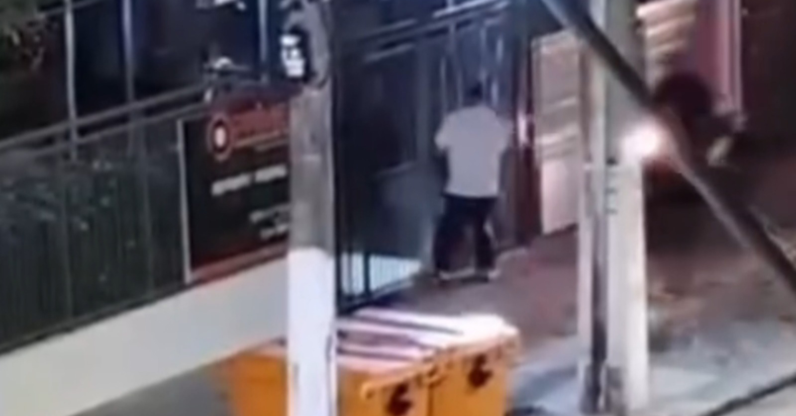 Nas imagens, a vítima ainda tenta reagir e derrubar o assaltante da moto. Ambos caem no chão, mas o criminoso rapidamente se levanta, recupera o veículo e tenta ligar a moto para fugir. No entanto, a moto não funciona e o assaltante fica por alguns minutos tentando fazer o veículo ligar